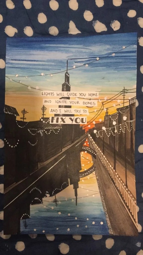 Inspired by a song “Fix You” by Coldplay she came up with this awesome piece which is featured at the top of this post.