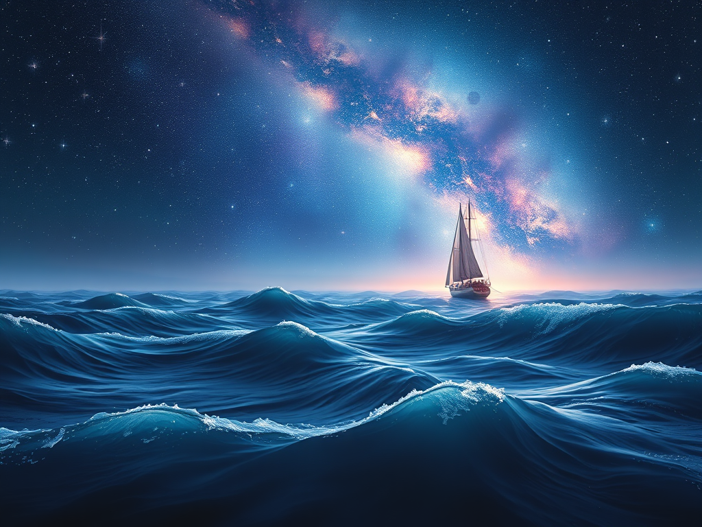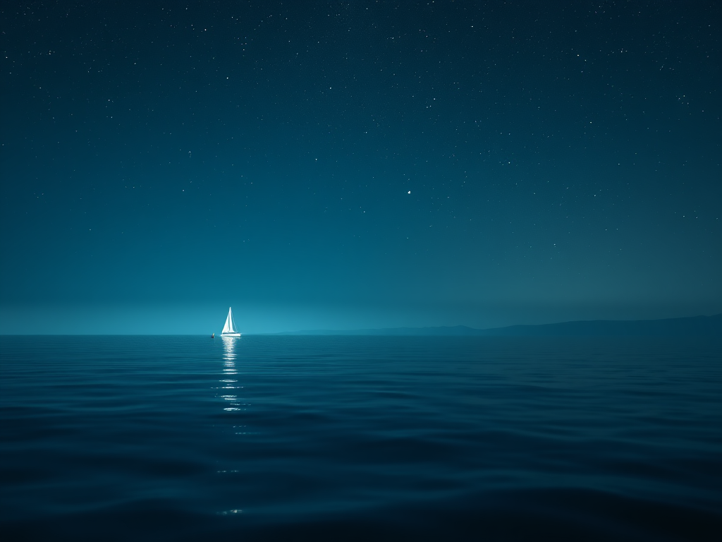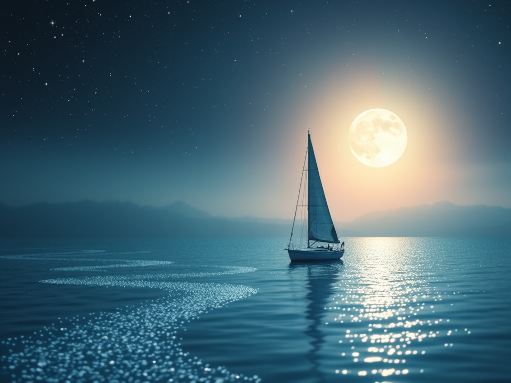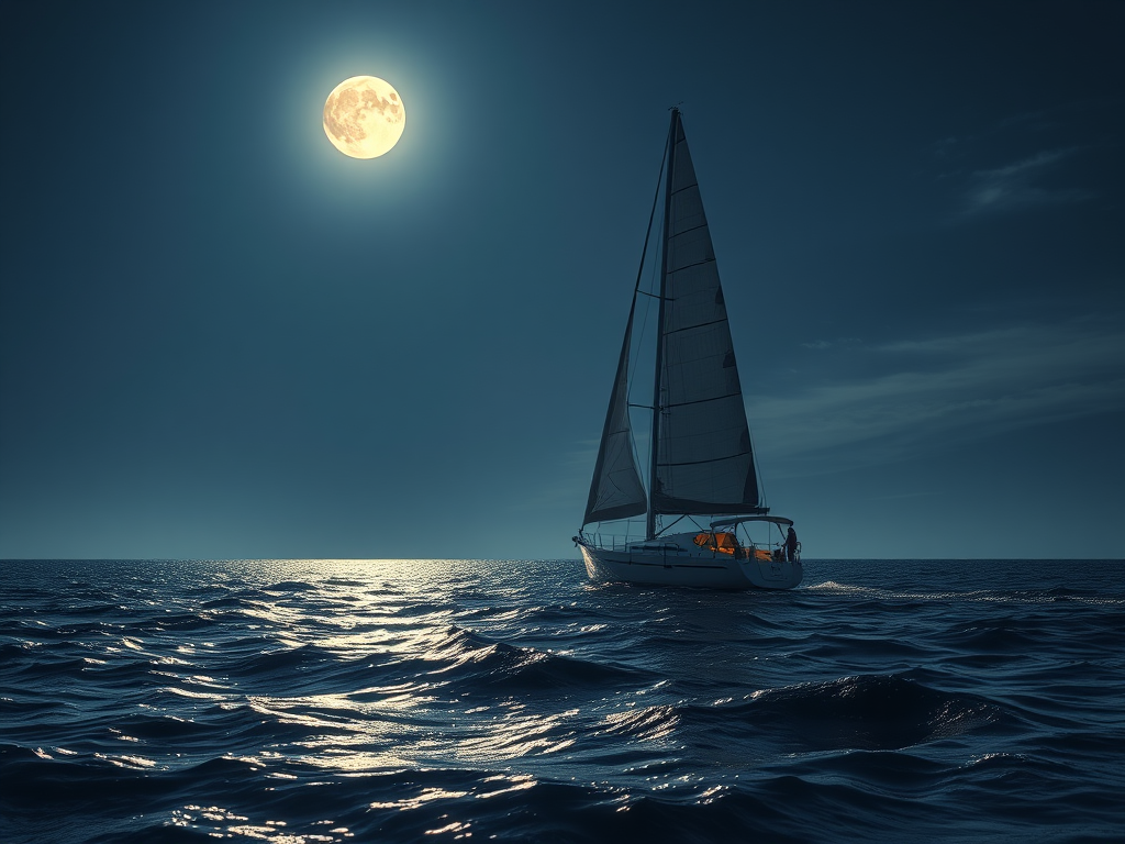 “Moonlit Voyage” is a poem that depicts a sailboat navigating the ocean under the moonlight, inviting readers on a journey where dreams and reality merge. It immerses them in serene beauty and contemplation, enhanced by the sensory experiences of waves, breeze, and salty air.