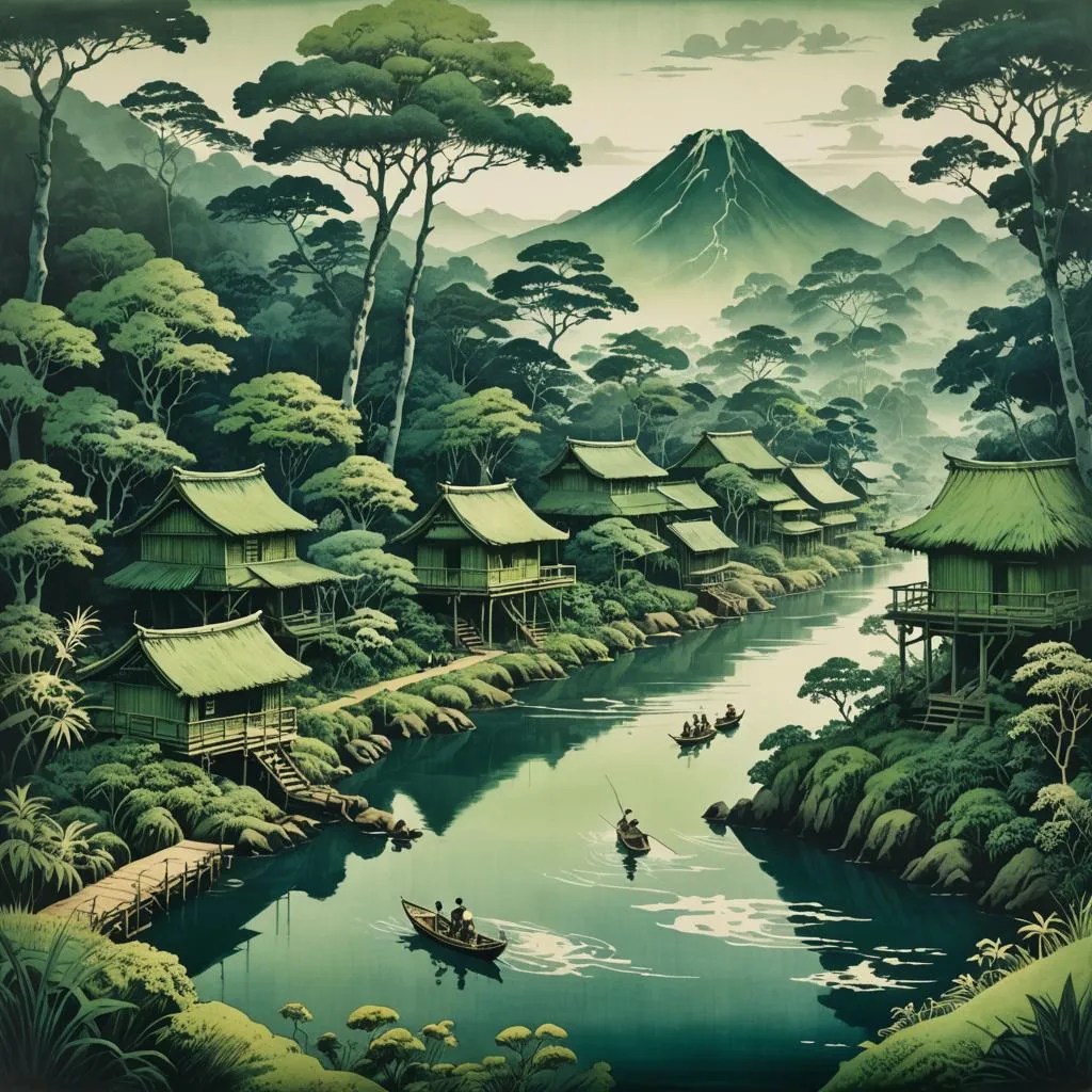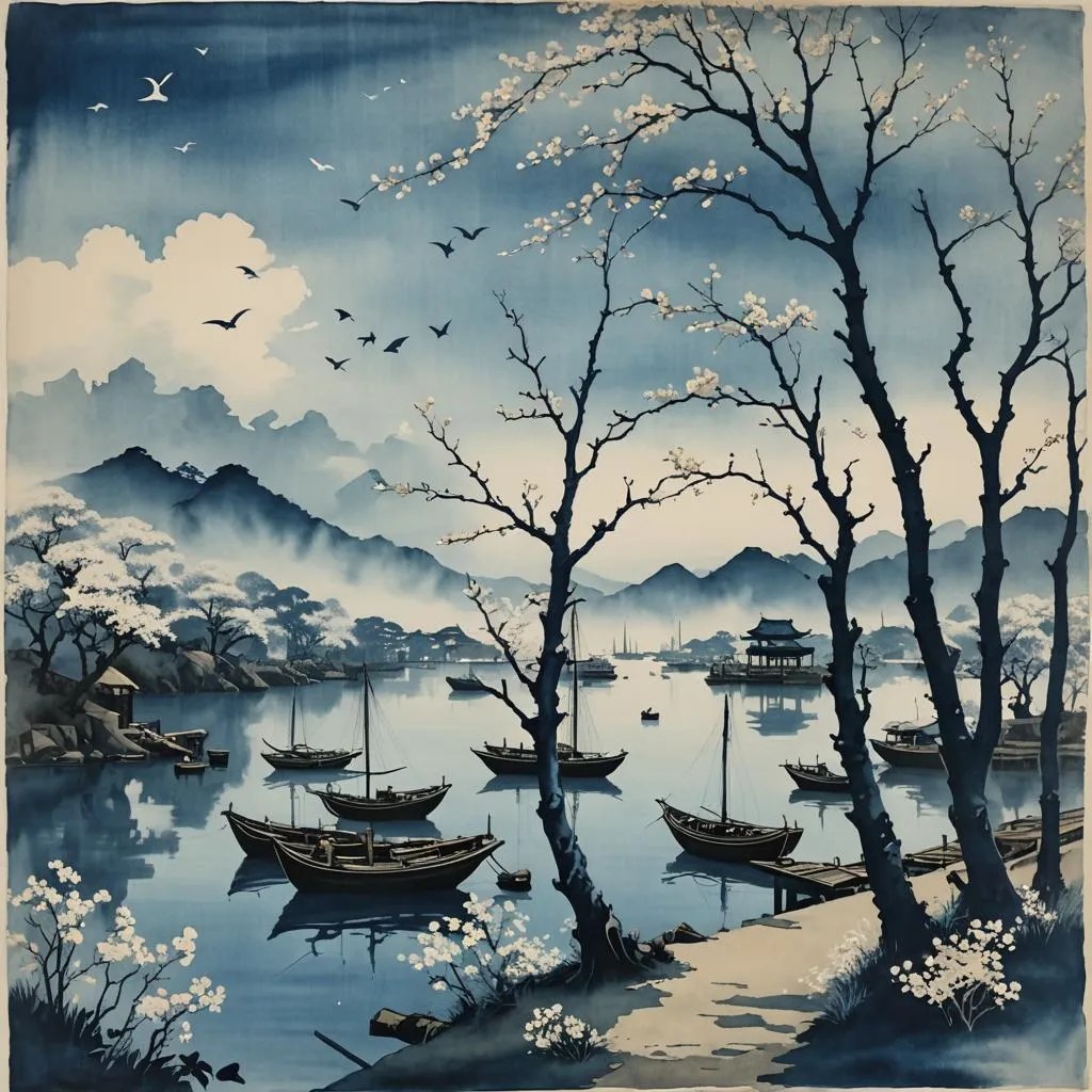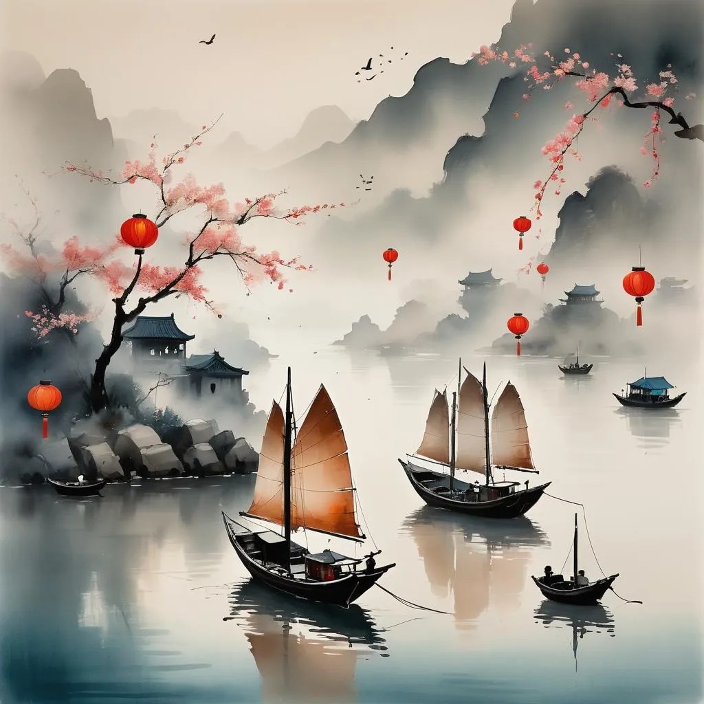 In this serene watercolor painting, a tranquil river scene features boats gliding across the water with their reflections shimmering, while cherry blossoms and colorful lanterns enhance the peaceful atmosphere. The artist captures tranquility through the harmonious blend of soft hues and gentle brushstrokes, inviting contemplation and a sense of serenity.