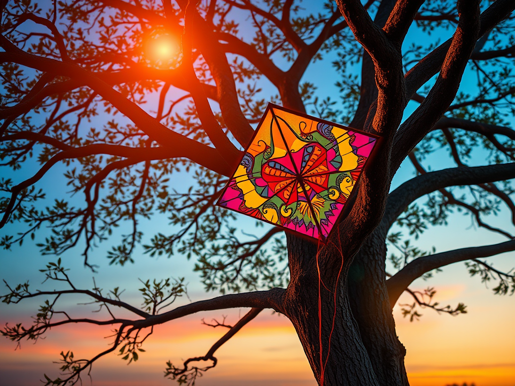 In the tree’s embrace, the kite symbolizes life’s impermanence and fleeting beauty, reflecting our experiences of soaring and falling through change, which lead to understanding, growth, and the beauty of shared journeys.
