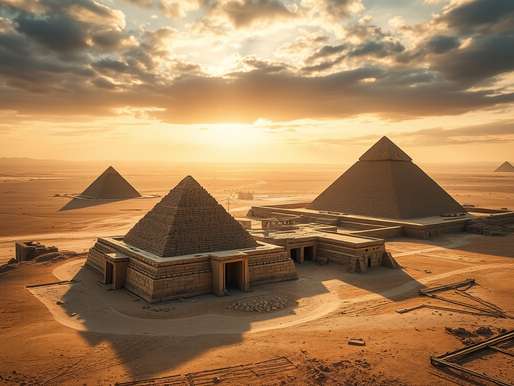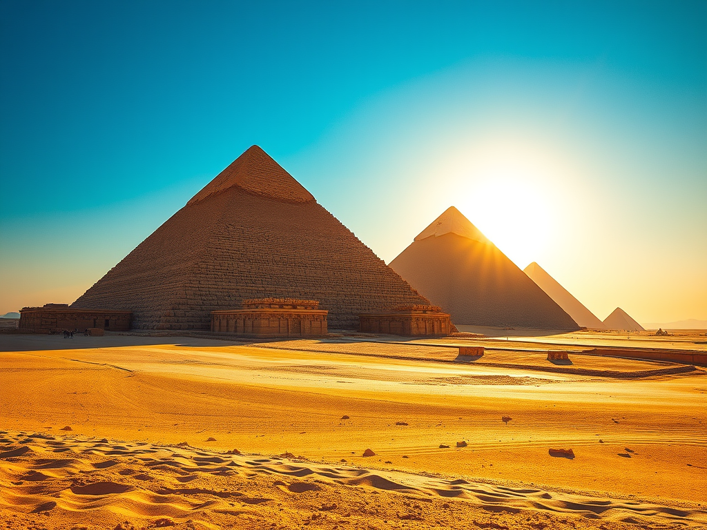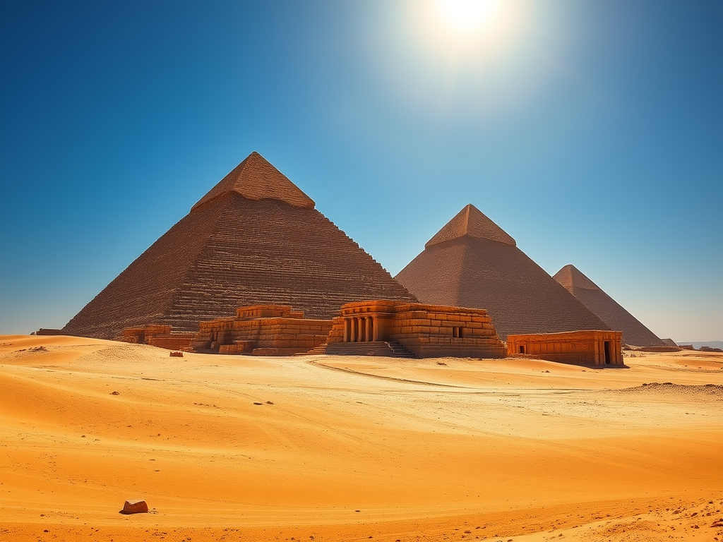 The pyramids stand as symbols of human achievement and the passage of time, evoking awe in a vast desert, with their enduring stones reflecting the ambition and ingenuity of their long-gone creators.