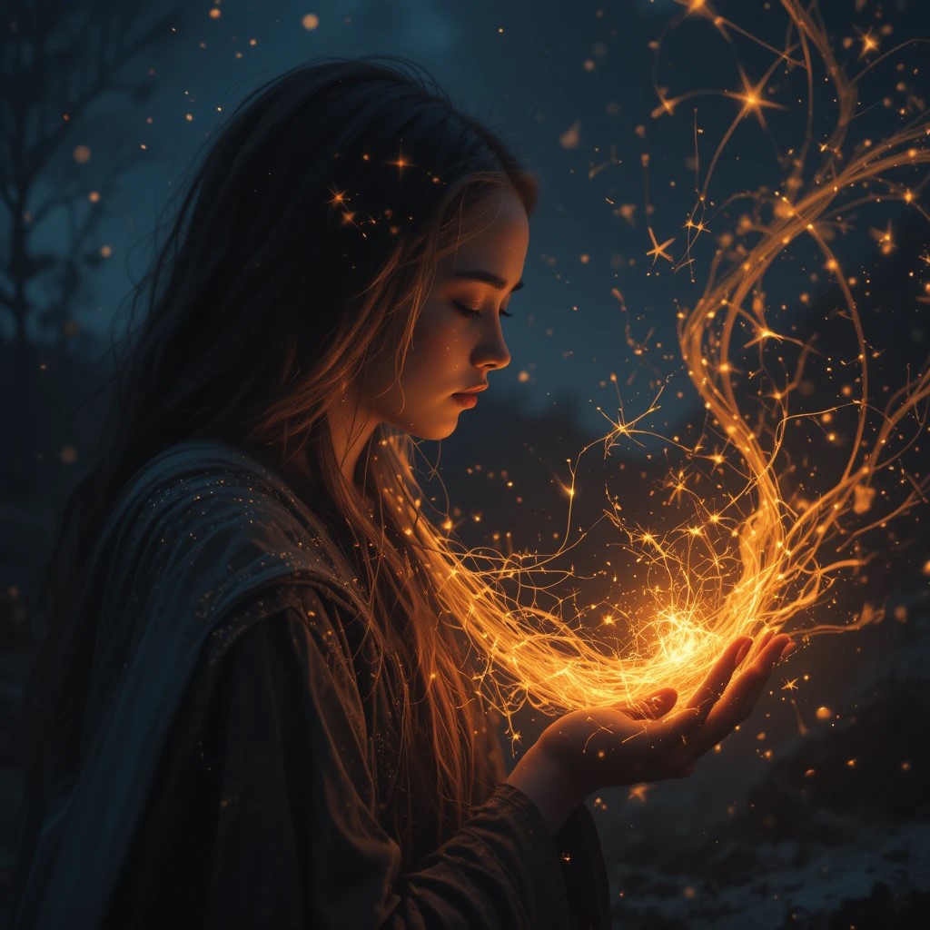 She exists in the space between beginnings and endings, embodying the transient nature of beauty and freedom. Stars from her hair symbolize her connection to the universe, and while she briefly shelters them, she does not possess them. Her essence is a dynamic pulse of life, marking movement and change. As the last star departs, she dissolves into light and silence, signifying the cyclical nature of the universe.