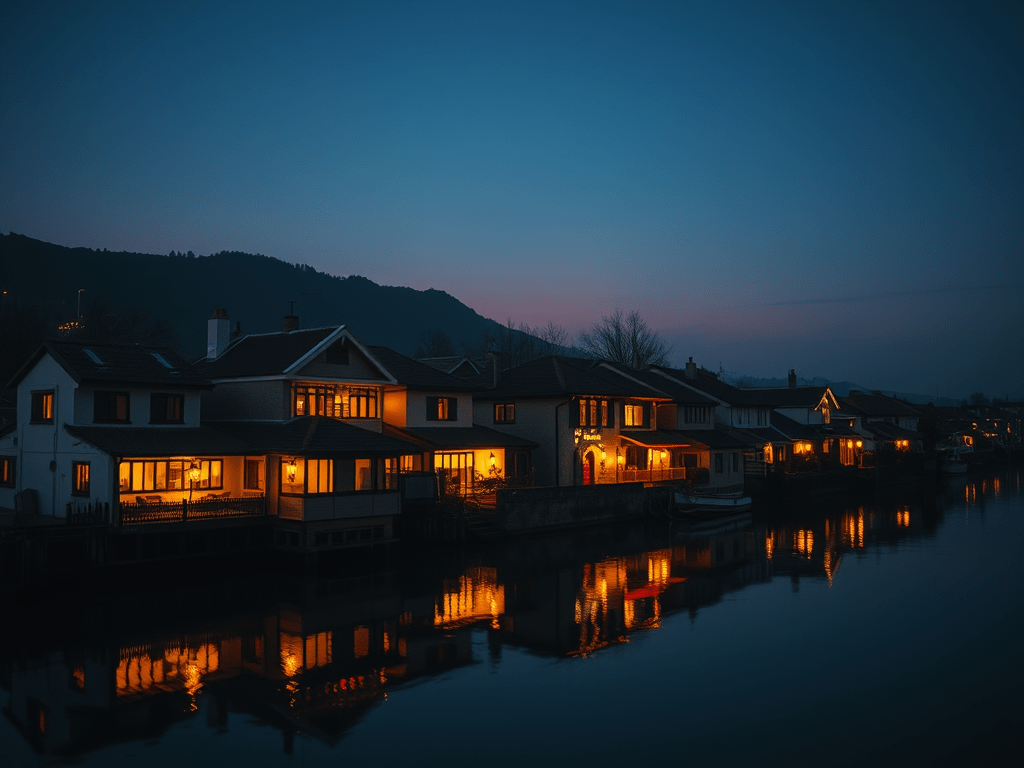 The poem encourages embracing life’s paradoxes, highlighting the interplay of light and darkness and the fleeting moments that reveal deeper truths, similar to how glowing houses reflect on water and blend into the night sky.