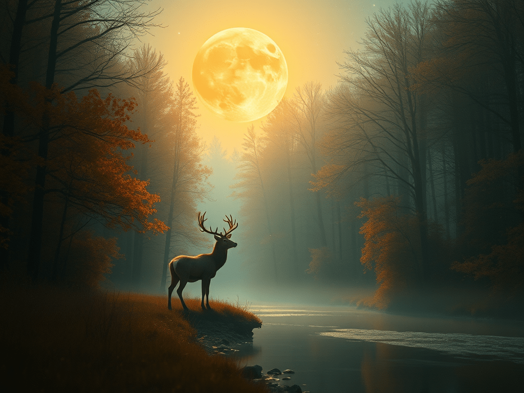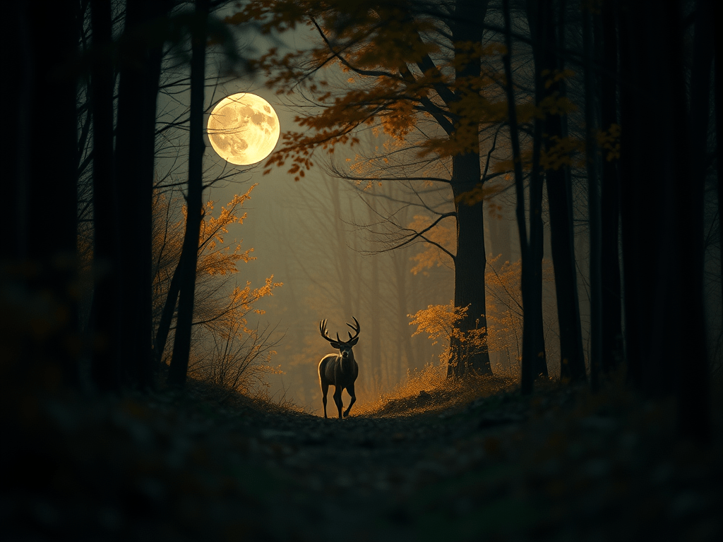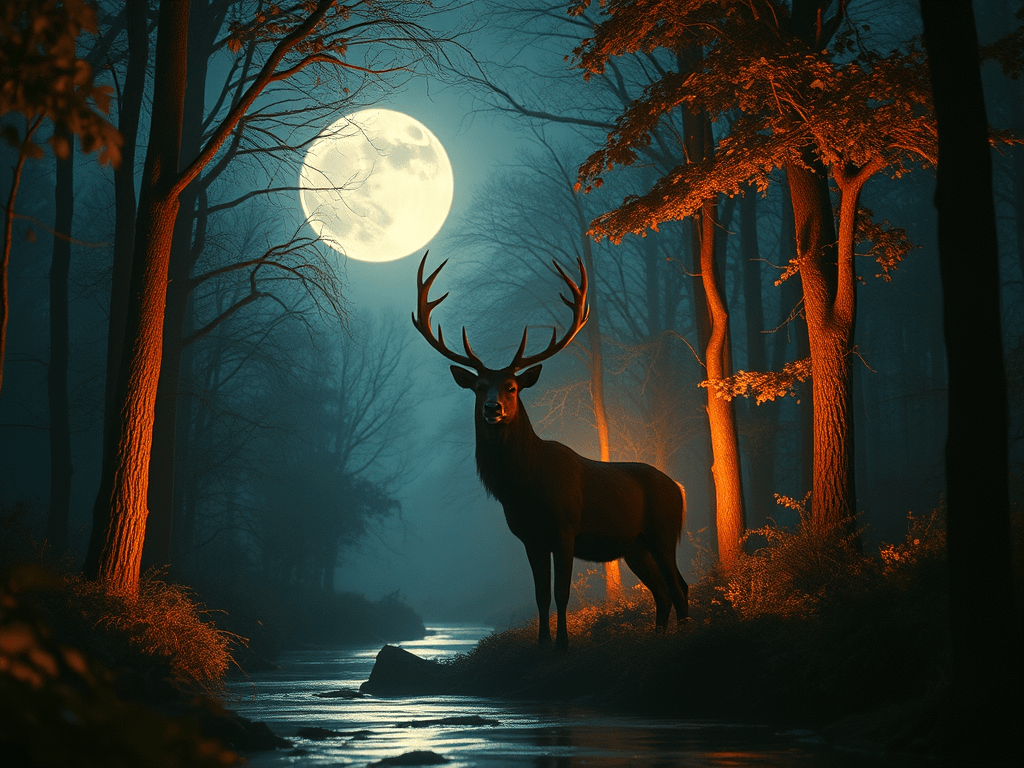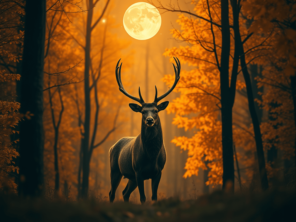 In a still, enchanting autumn forest illuminated by moonlight, the line between dream and reality blurs, revealing a place where whispered stories and ancient secrets coexist, with a majestic stag embodying the essence of suspended moments that remind us of the magic often overlooked in our busy lives.
