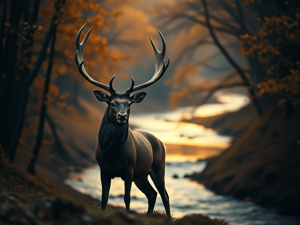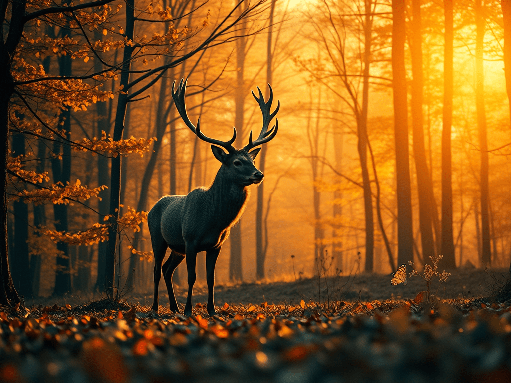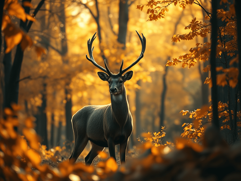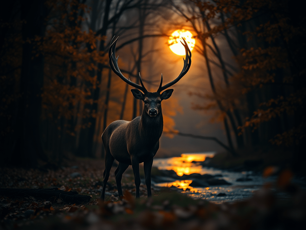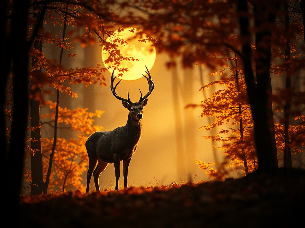 In a still, enchanting autumn forest illuminated by moonlight, the line between dream and reality blurs, revealing a place where whispered stories and ancient secrets coexist, with a majestic stag embodying the essence of suspended moments that remind us of the magic often overlooked in our busy lives.