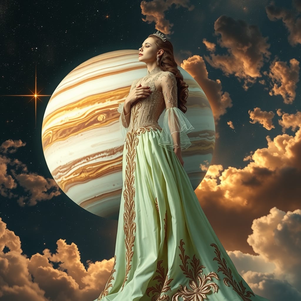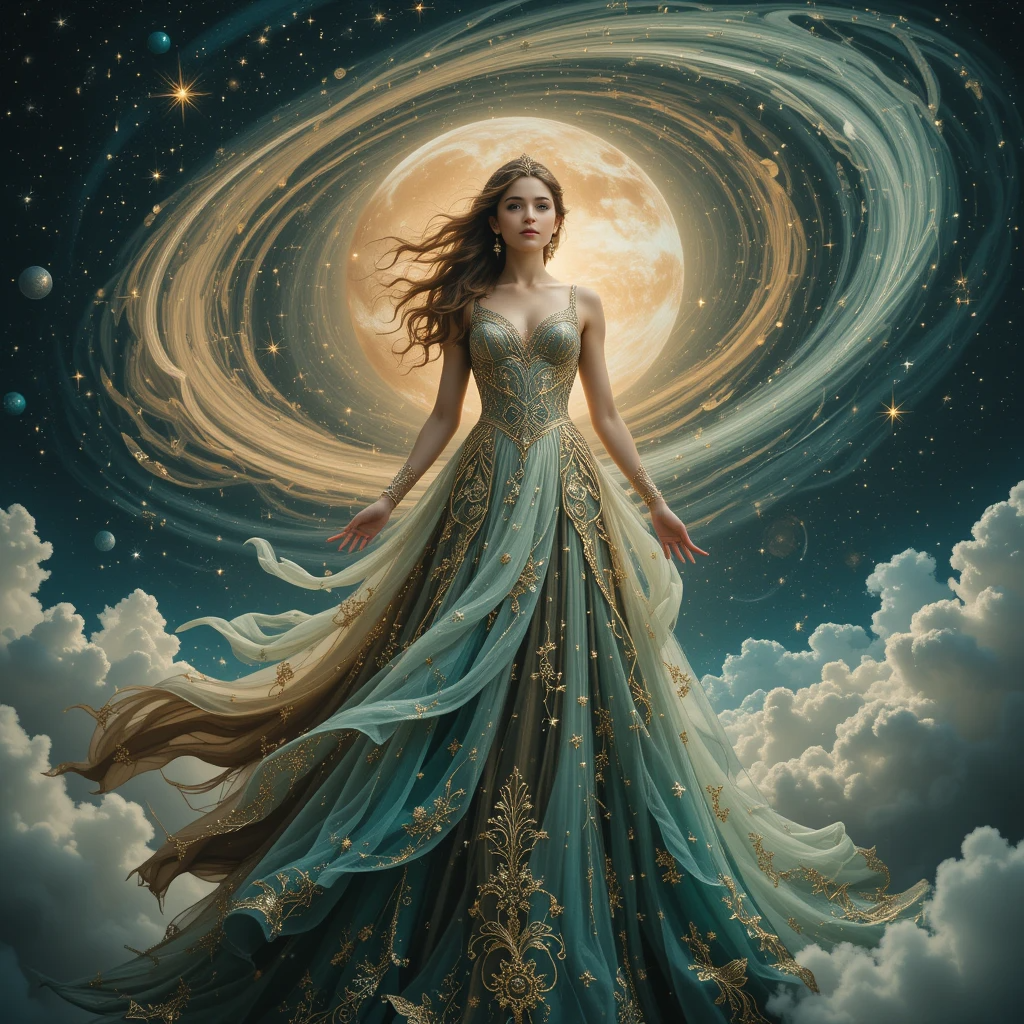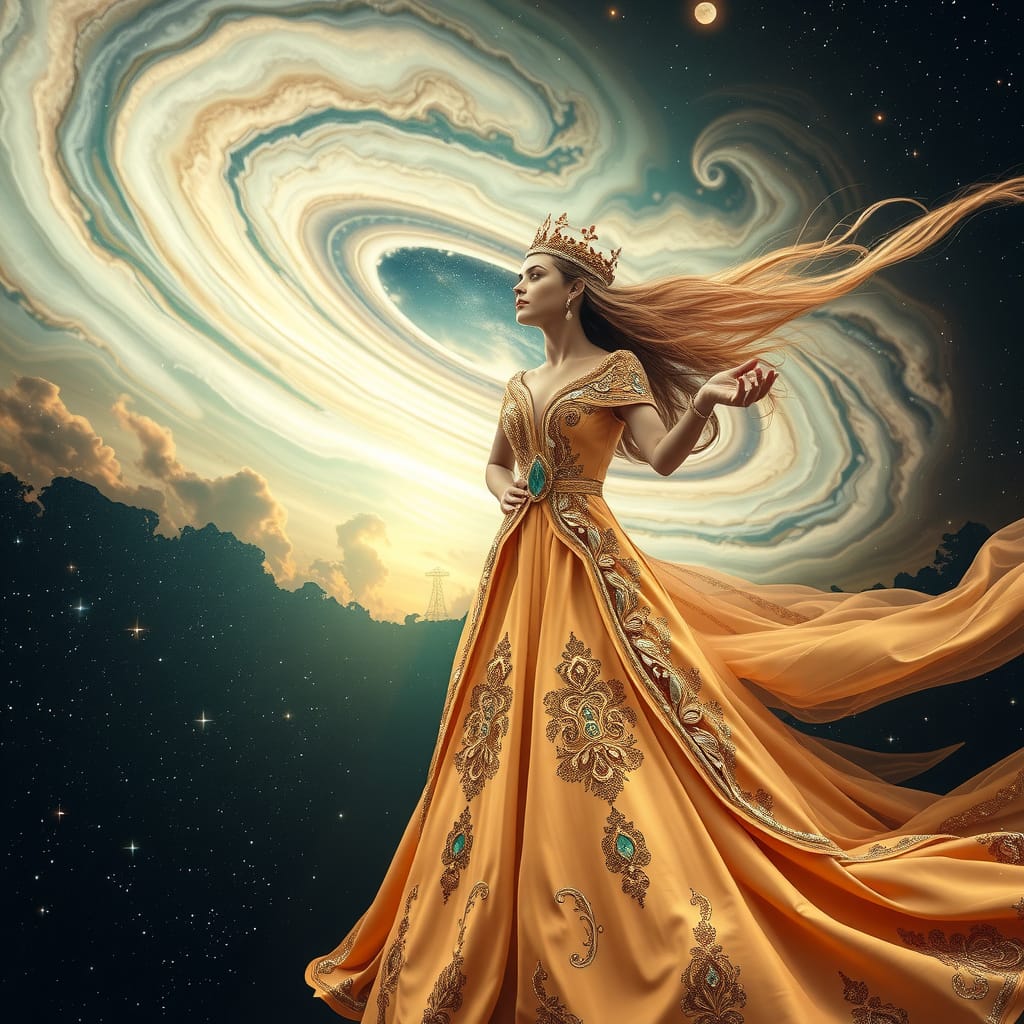 Among the veils of starlight and clouds spun from celestial whispers, there emerges a figure, neither bound by time nor unshaped by its currents. She stands not as an answer but as a hymn of infinite wonder; an embodiment of the questions we dare to dream. Draped in cosmic splendor, she dances on the edge of eternity, her being the nexus where mortal longing and divine silence converge. Let us step into her radiance, where each breath is an epiphany, each moment a universe unfolding.