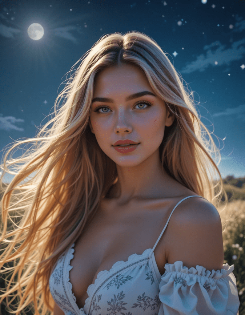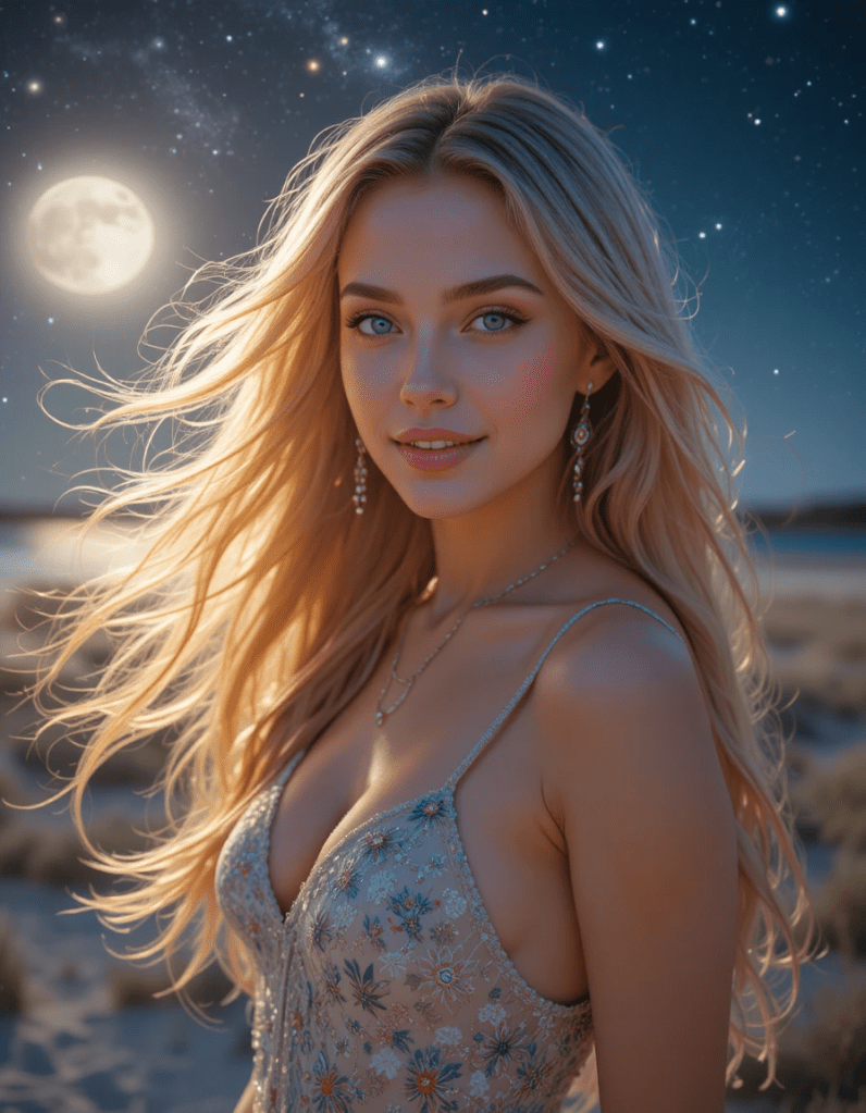 (Soft, shimmering piano chords with a delicate synth pad, creating a warm, starry-night ambiance. Slow, intimate tempo (around 80 BPM). The melody feels like a gentle breeze, inviting and tender.)