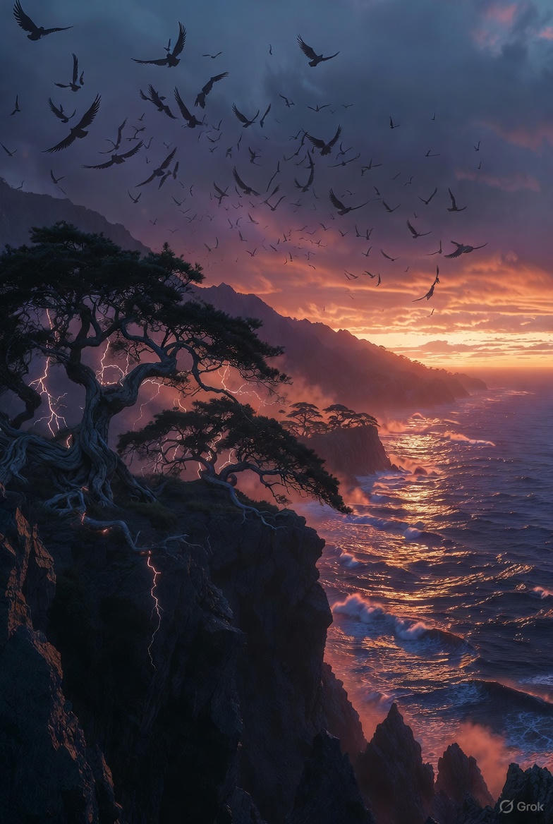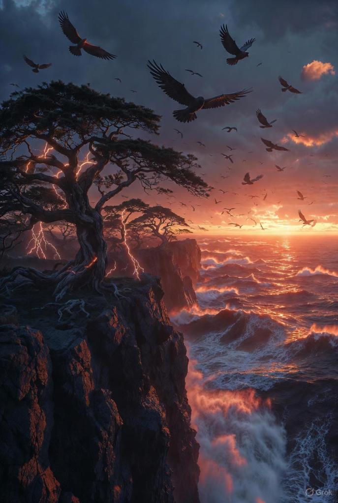 Gnarled oaks rise like prophets, lightning-scarred and thunder-torn